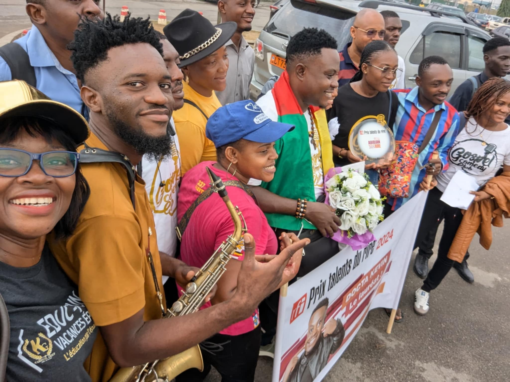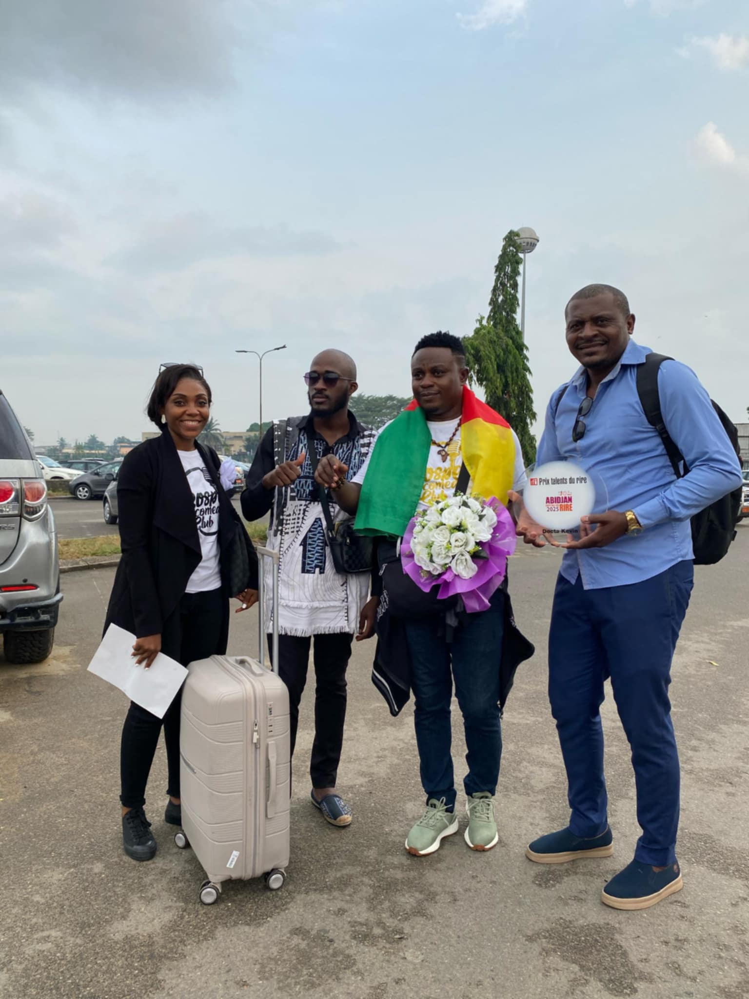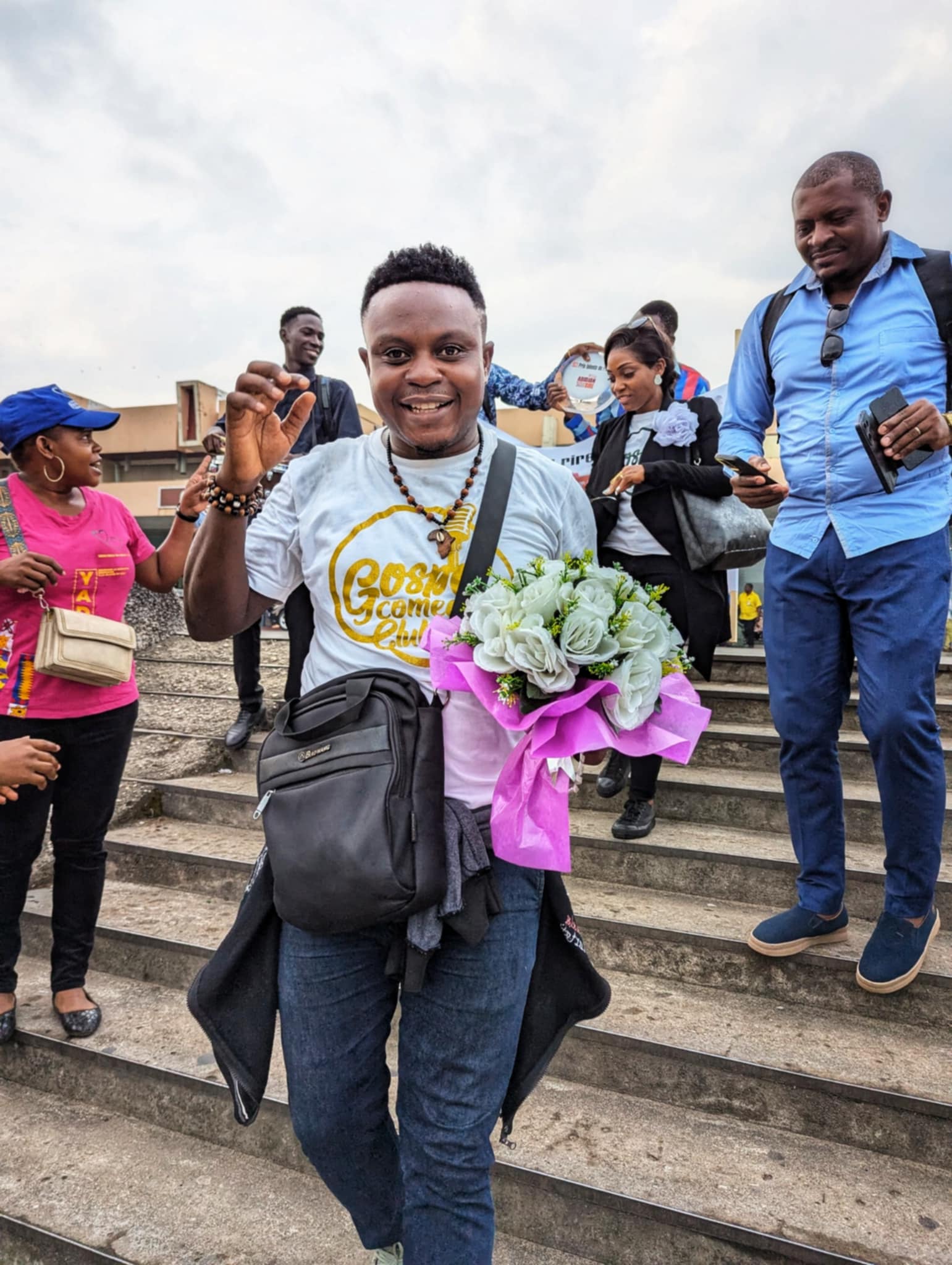 The gospel comedian, returning from Abidjan, for the event nicknamed "Capital of Laughter", landed around 7 a.m., visibly moved by the warmth of the welcome. When he got off the plane, a delegation including his team from the Gospel Comedy Club, the Fadiese Academy, representatives of “Mercredi en Montagne” and many fans were waiting for him. The festive atmosphere was enhanced by banners, flowers and t-shirts in the colors of the Gospel Comedy Club, creating an atmosphere which did not fail to attract the attention of other travelers.