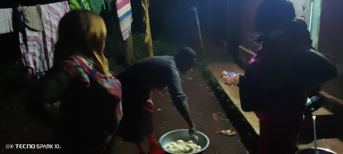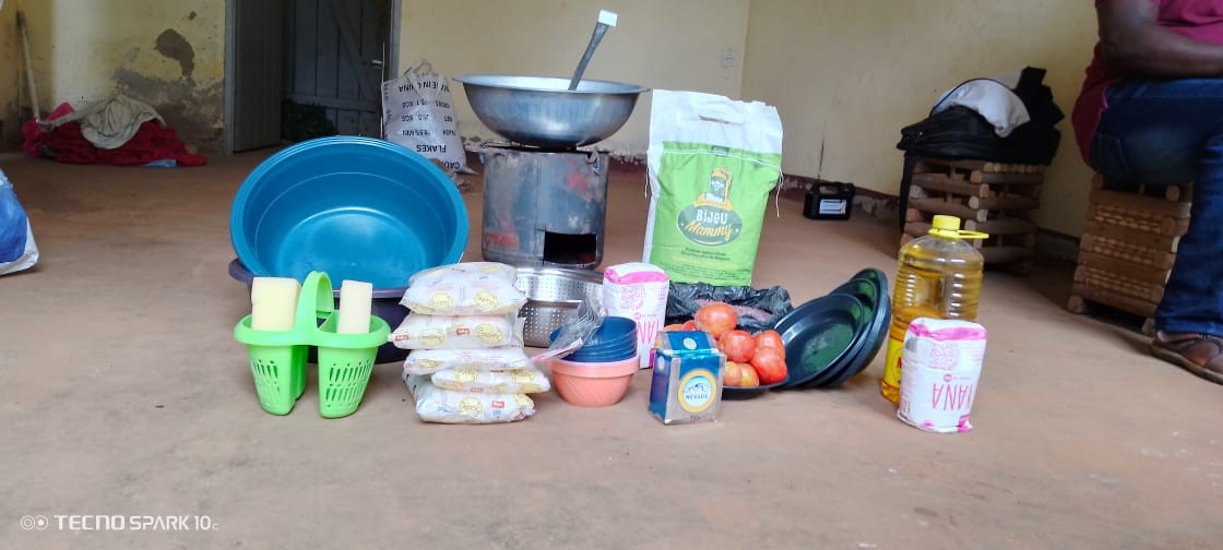 Nous avons pu offrir un sac de farine, de l’huile, le sucre, les ustensiles, le haricot, à Mireille, une personne qui jusqu’ici manifeste une certaine évidence de foi en Christ. Elle a déjà commencé à vendre les beignets au marché. Gloire à Dieu