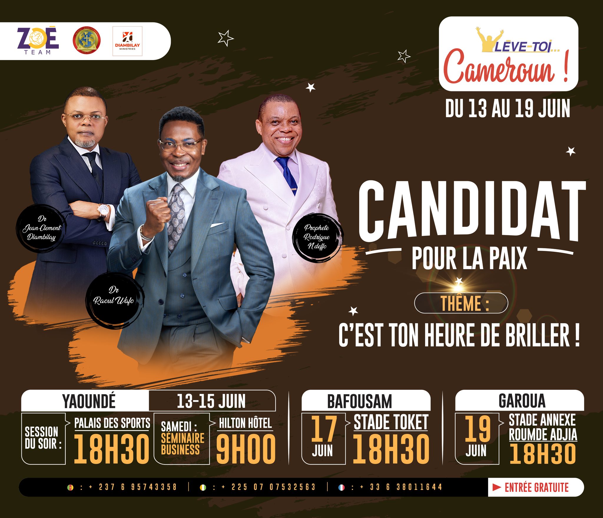 YaoundĂ© (June 13 to 15) â Palais des Sports at 6:30 p.m. | Hilton Hotel (Business Seminar) at 9:00 a.m.